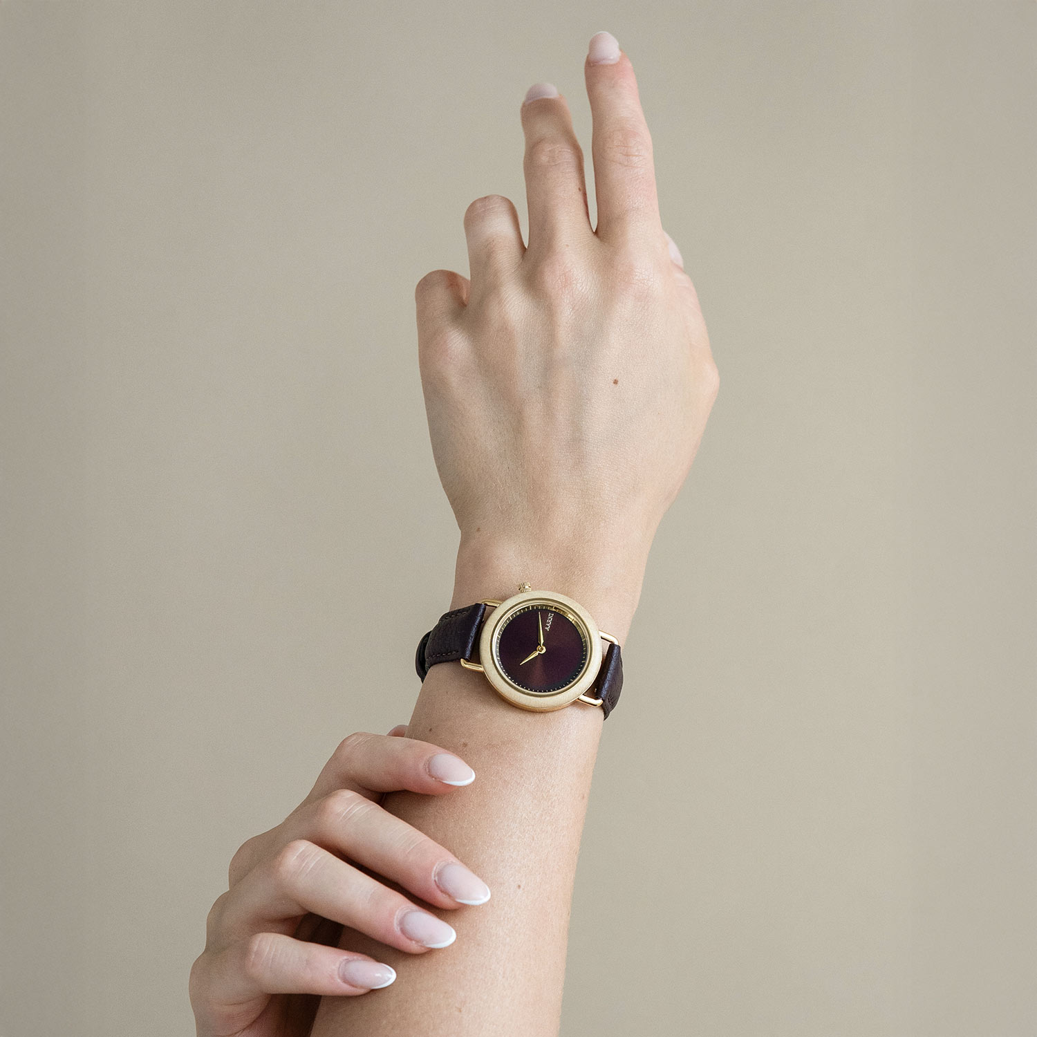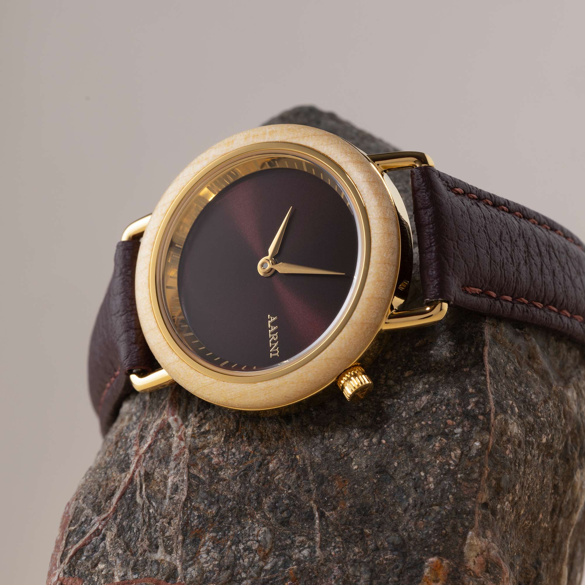 Tähän juhlamalliin halusimme kiteyttää sen, mistä kaikki sai alkunsa kymmenen vuotta sitten: metsien ainutlaatuisista materiaaleista. Kellossa yhdistyvät kotimainen koivu ja pehmeä hirvennahka – Suomen luonnon kaksi vahvaa ja kaunista elementtiä.