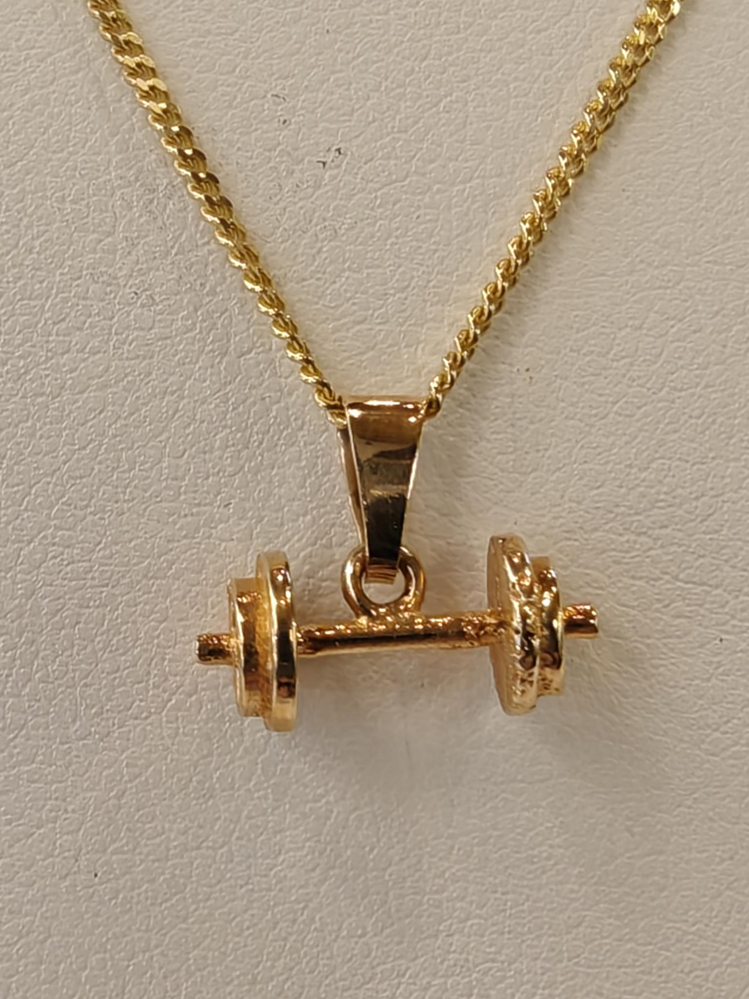 Puntti, käsipaino, dumbbell, monta rakasta sanaa tälle riipukselle. Näytä innostuksesi salitreeneihin myös korun muodossa:). Riipuksen koko 14x6mm, lenkki 5mm. Keltakultaa 585/14k. Ketju myydään erikseen.