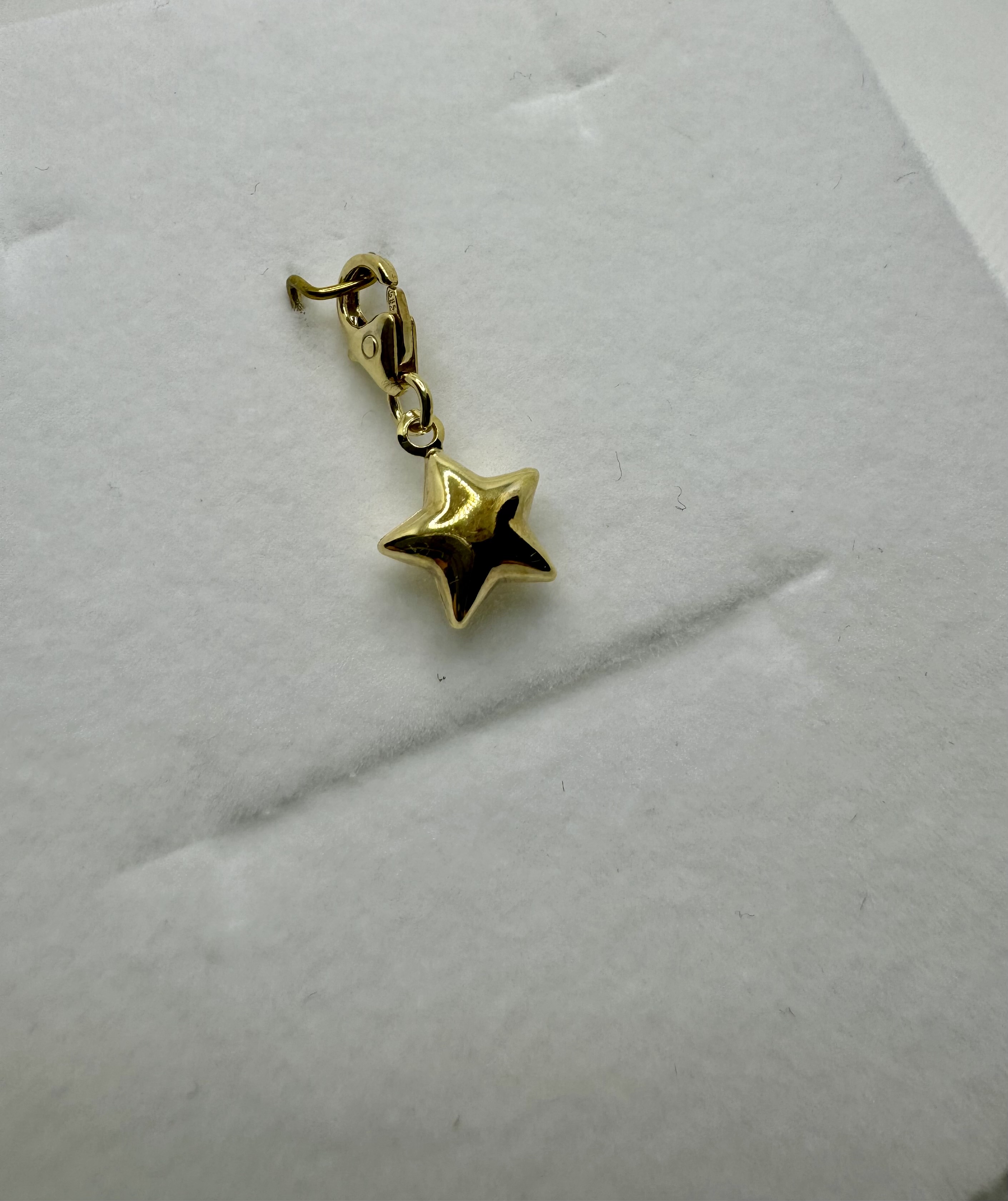 Kultainen tähti riipus papukaija lukolla. 14 karaatin kultaa. Tähden halkaisija 9mm. Kokonaispituus 20mm.